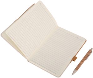 A5 size notebook with cork and linen cover including 80 sheet lined paper and a matching colour pen loop. Features a one push action ball pen with a cork wrapped paper barrel, and a solid colored wheat straw trim, refills are German dokumental ink providing an extended writing distance. Packaged in a kraft box.