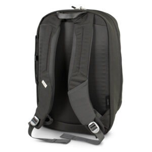 It features a padded laptop sleeve that fits laptops up to 16 inches, a document sleeve, a large J-zip front panel for easy access, internal organiser pockets, a key clip, and a scratch-free zippered front panel. A low-profile water bottle pocket and a quick-release aluminium security hook add convenience and peace of mind for commuting or travel.