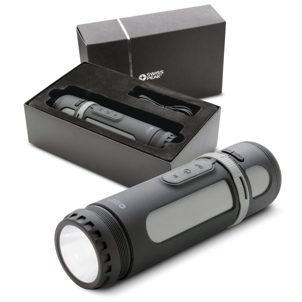 Beyond power and sound, this device features a powerful 250-lumen LED lantern and a versatile four-function torch, cementing its status as the ultimate outdoor utility tool. Presented beautifully in a premium Swiss Peak gift box complete with a Micro-B USB cable, it offers a deeply respectful unboxing experience. Custom pad printing your corporate logo onto the grey internal strip guarantees your brand remains highly visible on a product that active professionals will actually use and depend on for years to come.